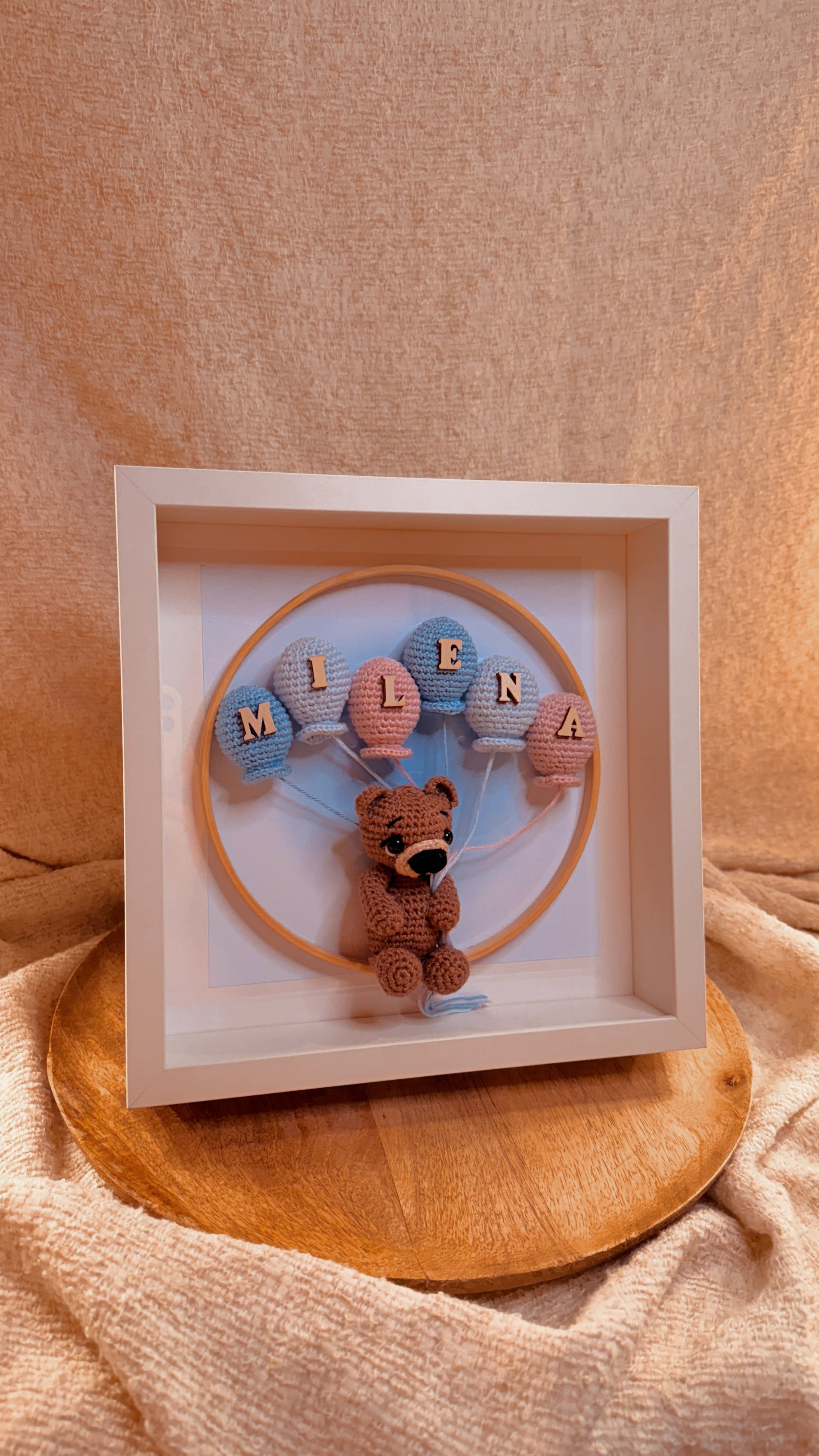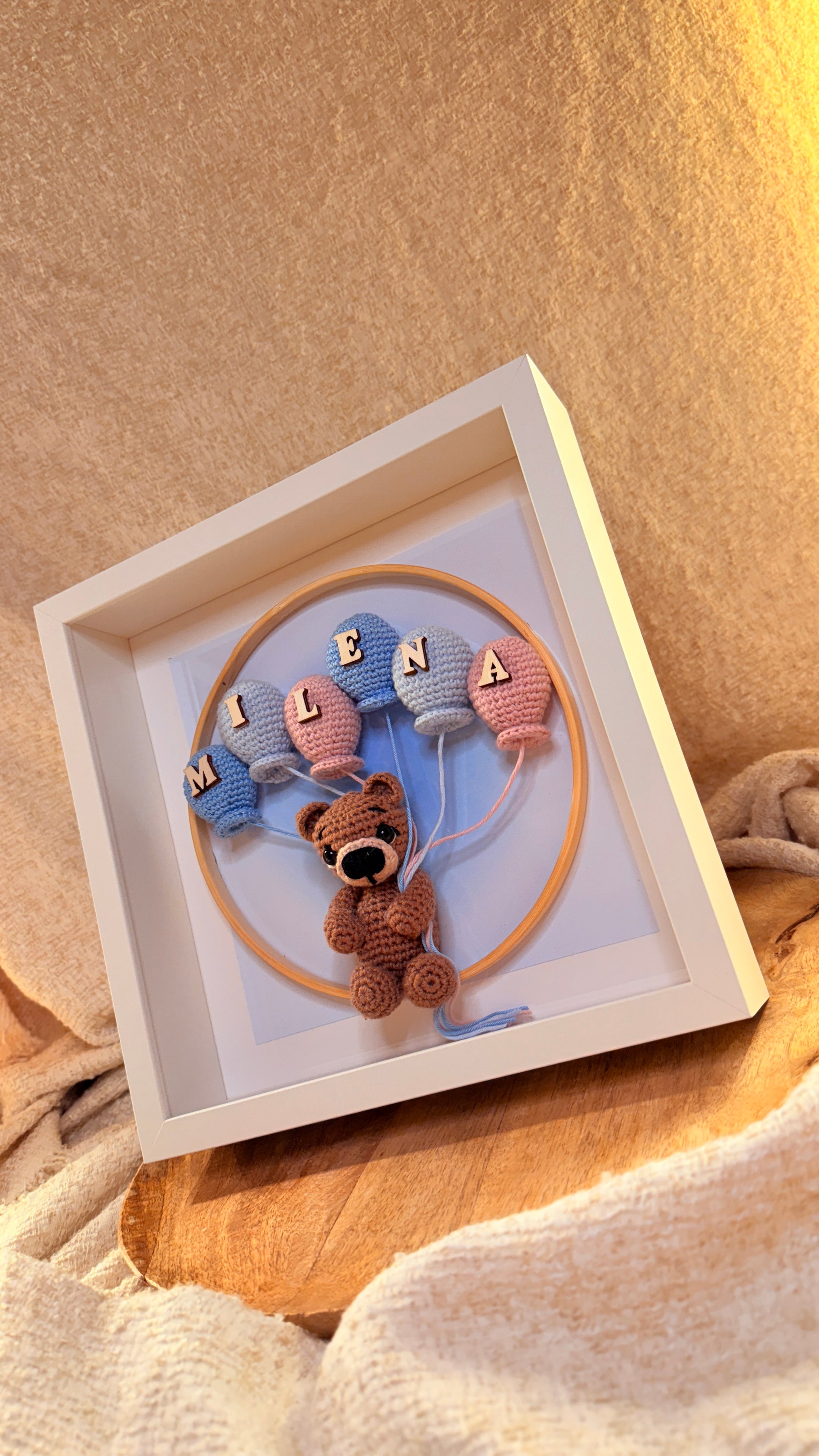 Dieser liebevoll gestaltete Bilderrahmen ist ein einzigartiges Geschenk zur Geburt, Taufe oder als Deko fürs Kinderzimmer. Der kleine gehäkelte Bär hält bunte Luftballons, die mit dem Namen des Kindes versehen werden – so entsteht ein ganz persönliches Erinnerungsstück.