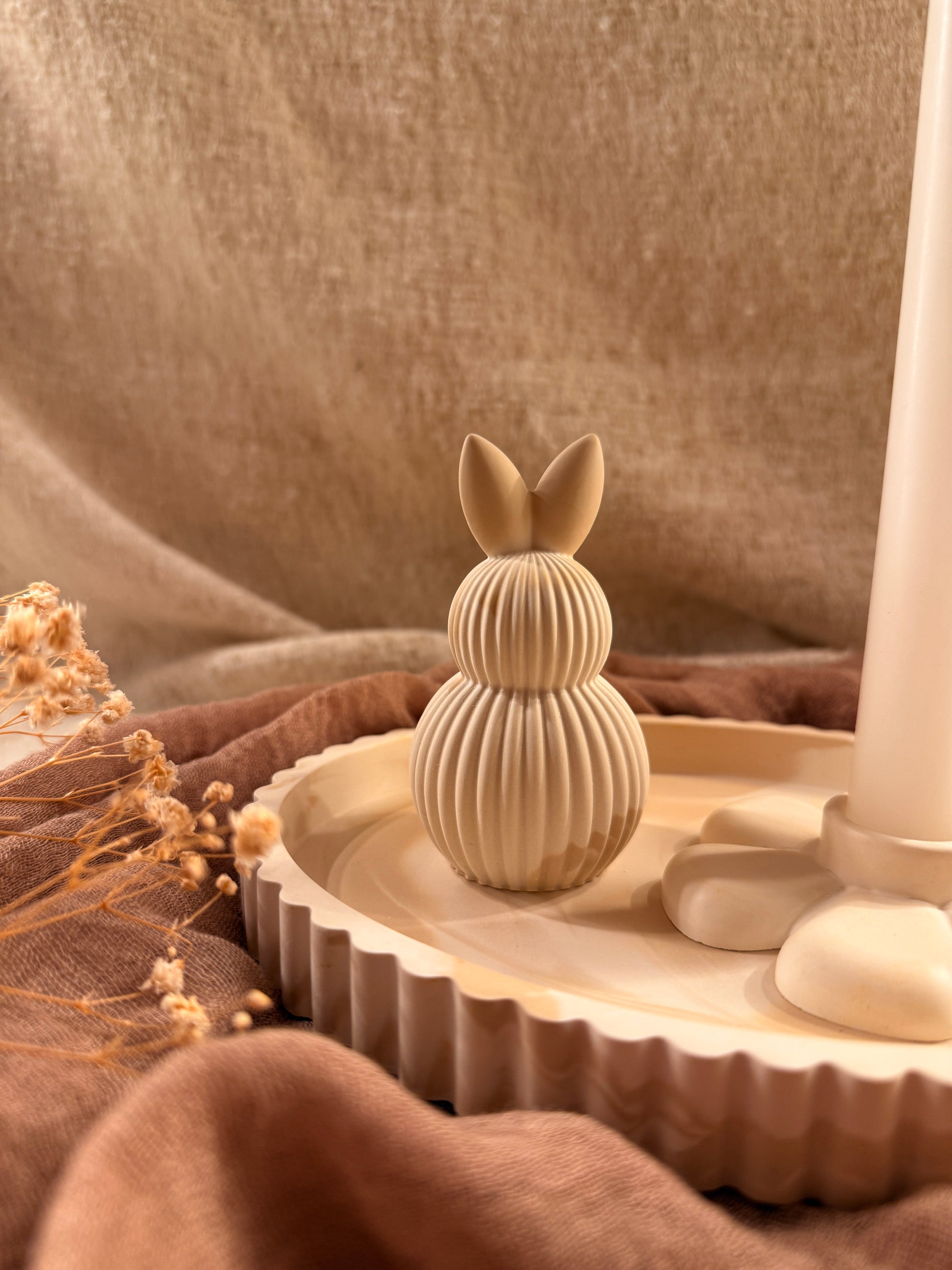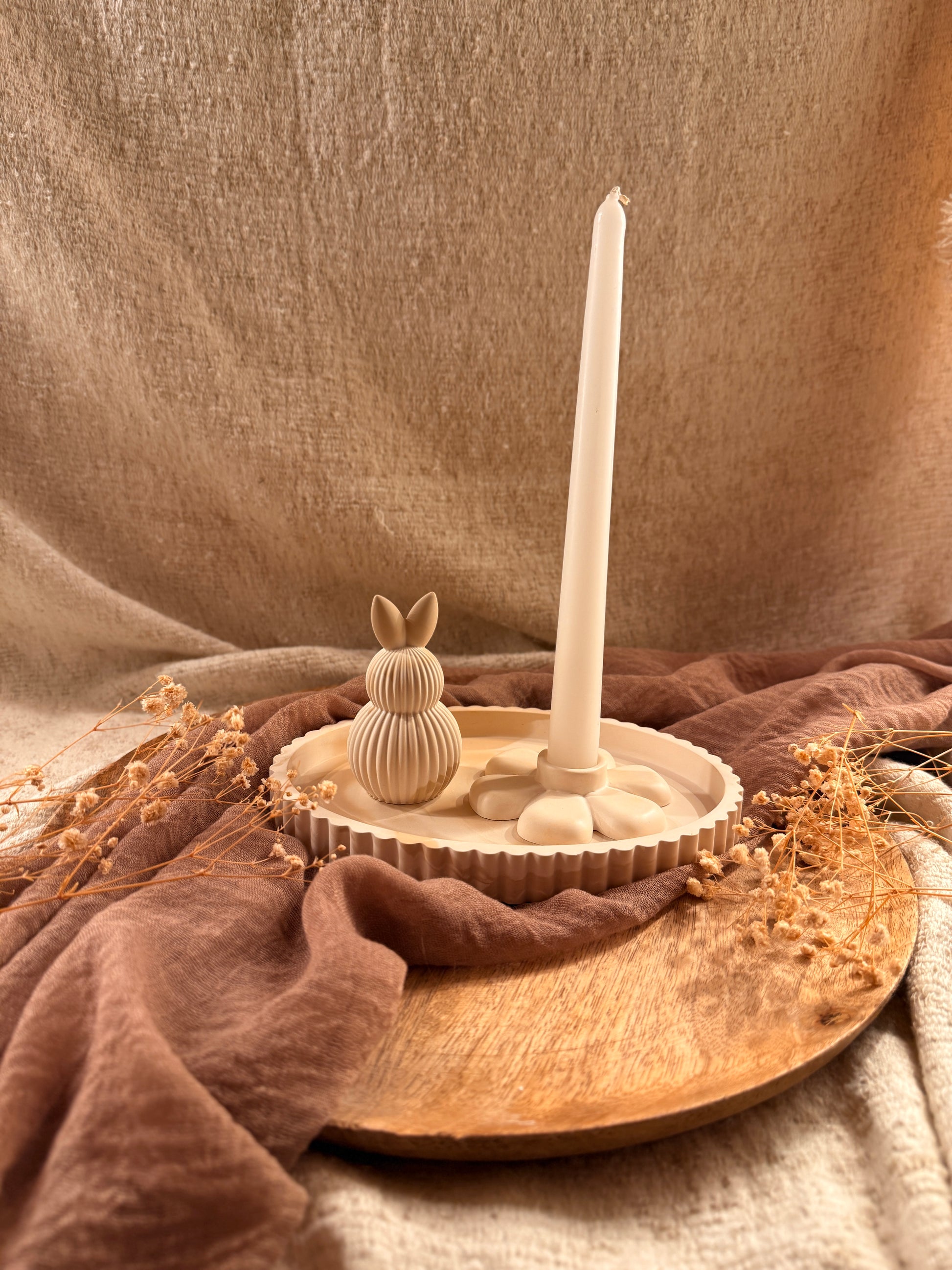 Dieses liebevoll zusammengestellte Deko-Set bringt eine ruhige, natürliche Frühlingsstimmung in dein Zuhause. Das Set besteht aus einem schlichten Dekotablett, einem Blumen-Kerzenhalter für Stabkerzen und einer kleinen Hasenfigur. Die harmonisch aufeinander abgestimmten Formen und Farben machen das Set zu einem zeitlosen Hingucker – perfekt für Tisch, Sideboard oder als besonderes Geschenk.