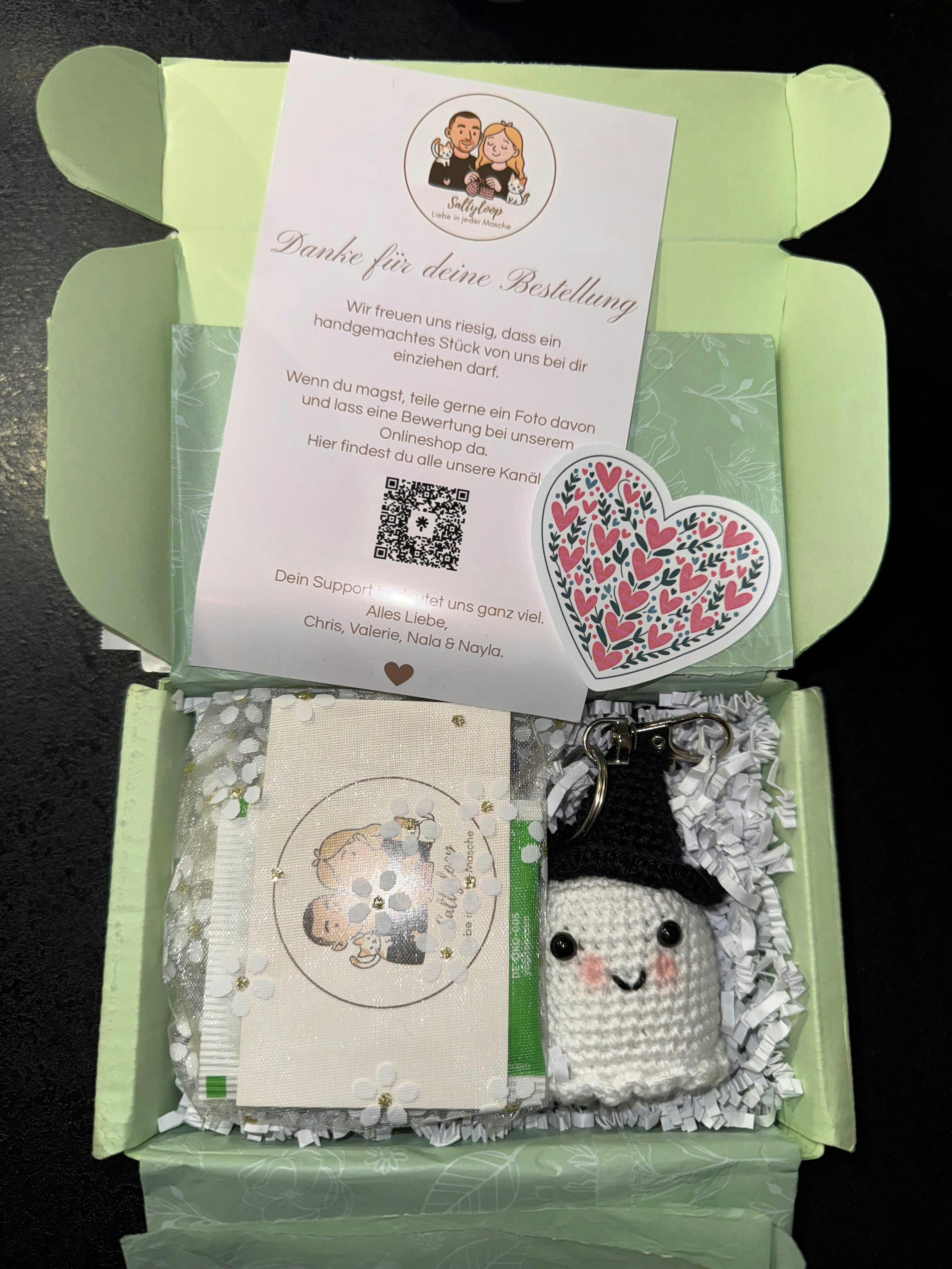 Dieses süße kleine Geistchen bringt magischen Halloween-Charme in dein Zuhause! Ob als Schlüsselanhänger, Taschenanhänger, Autoanhänger oder einfach als niedliche Deko – es sorgt garantiert für ein Lächeln. Mit seinem liebevoll gehäkelten Hexenhut ist es ein ganz besonderes Accessoire und auch eine originelle Geschenkidee für alle, die Halloween und Handarbeit lieben.