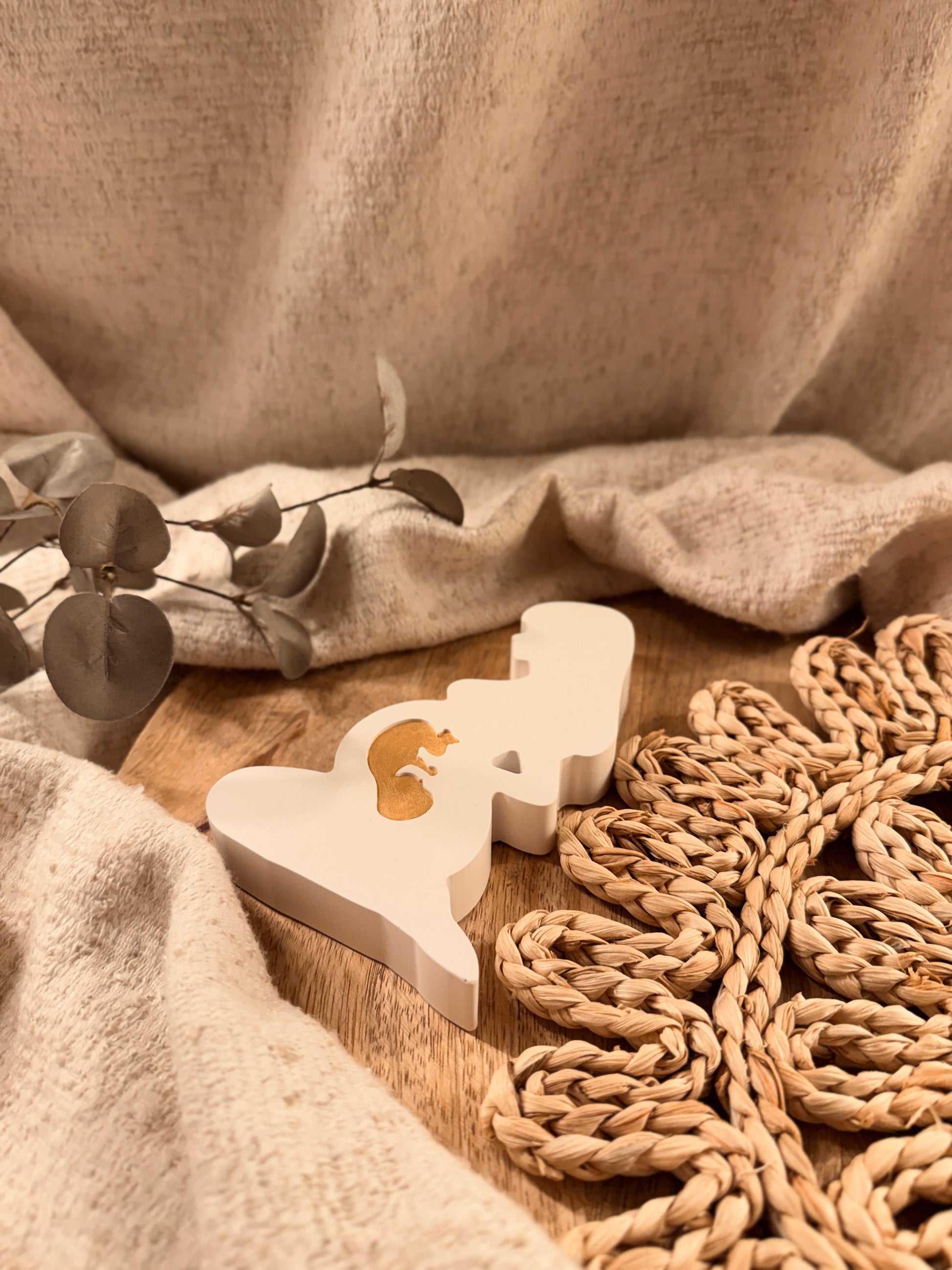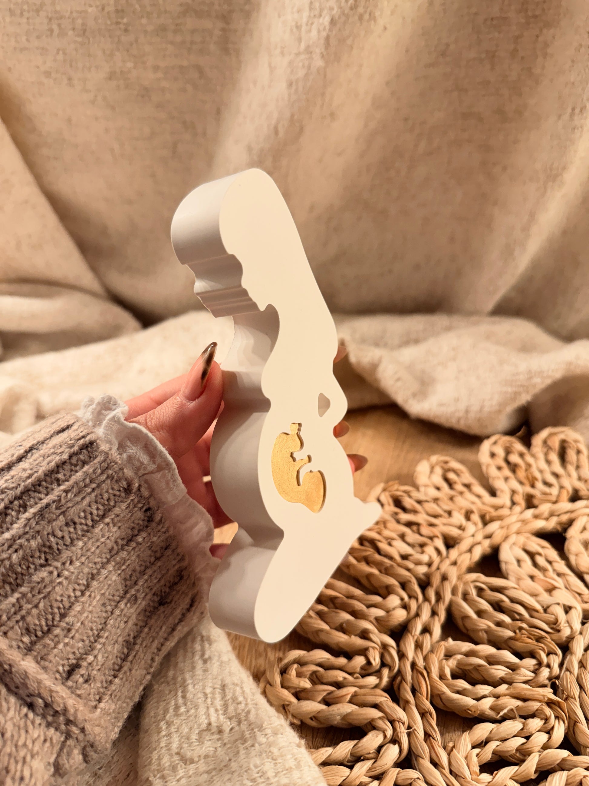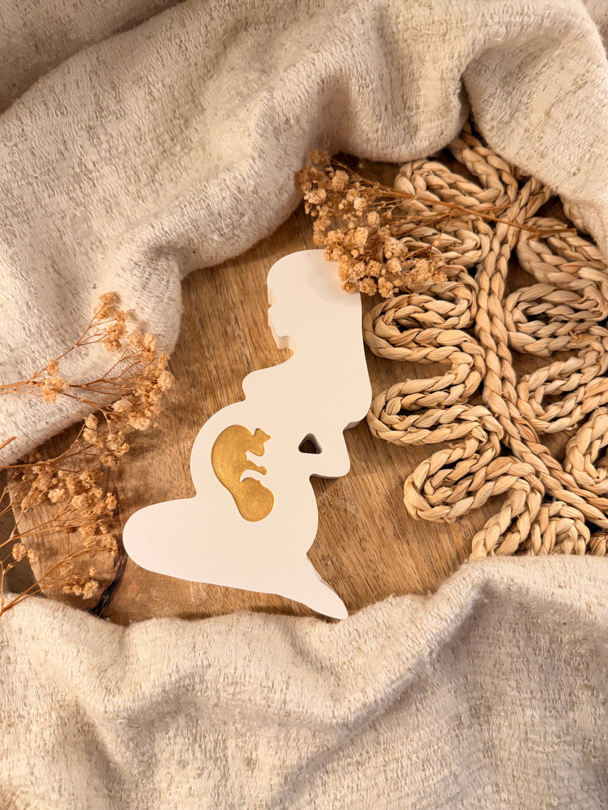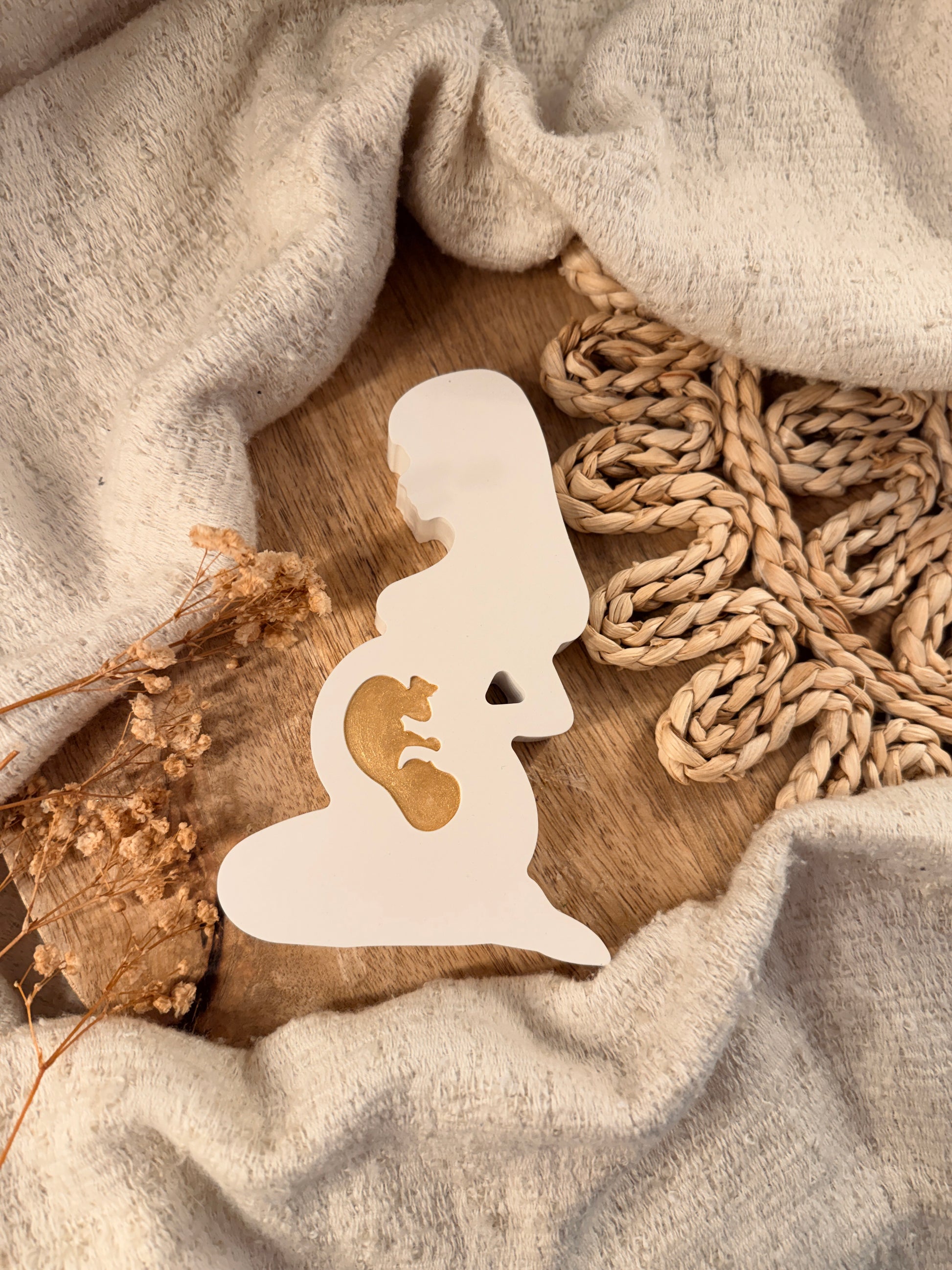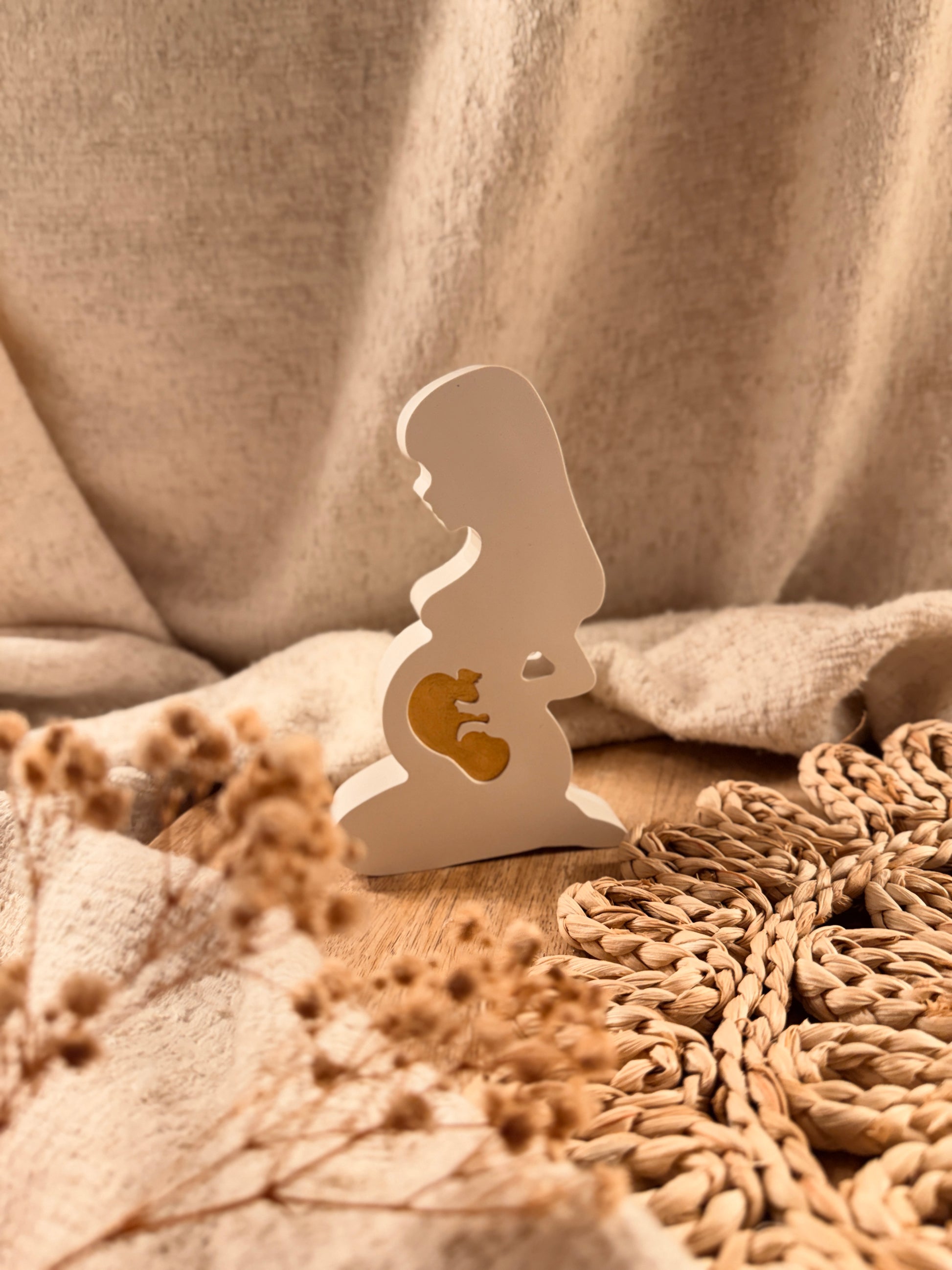 Diese besondere Dekofigur wird mit ganz viel Liebe von Hand gefertigt und steht für eines der größten Wunder des Lebens. Die schlichte Silhouette einer schwangeren Frau mit dem kleinen Embryo im Bauch symbolisiert Nähe, Geborgenheit und die tiefe Verbindung zwischen Mama und Baby.