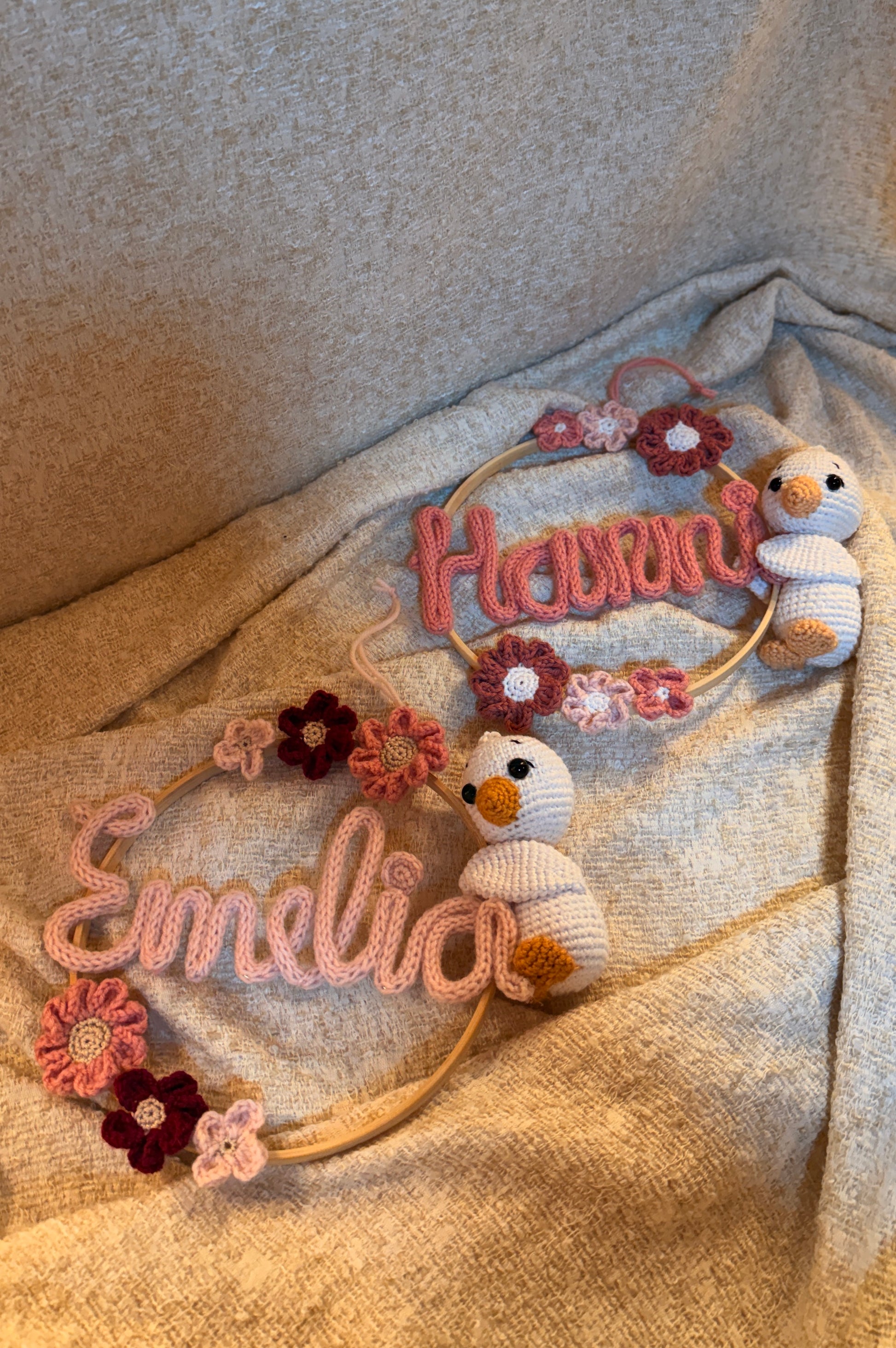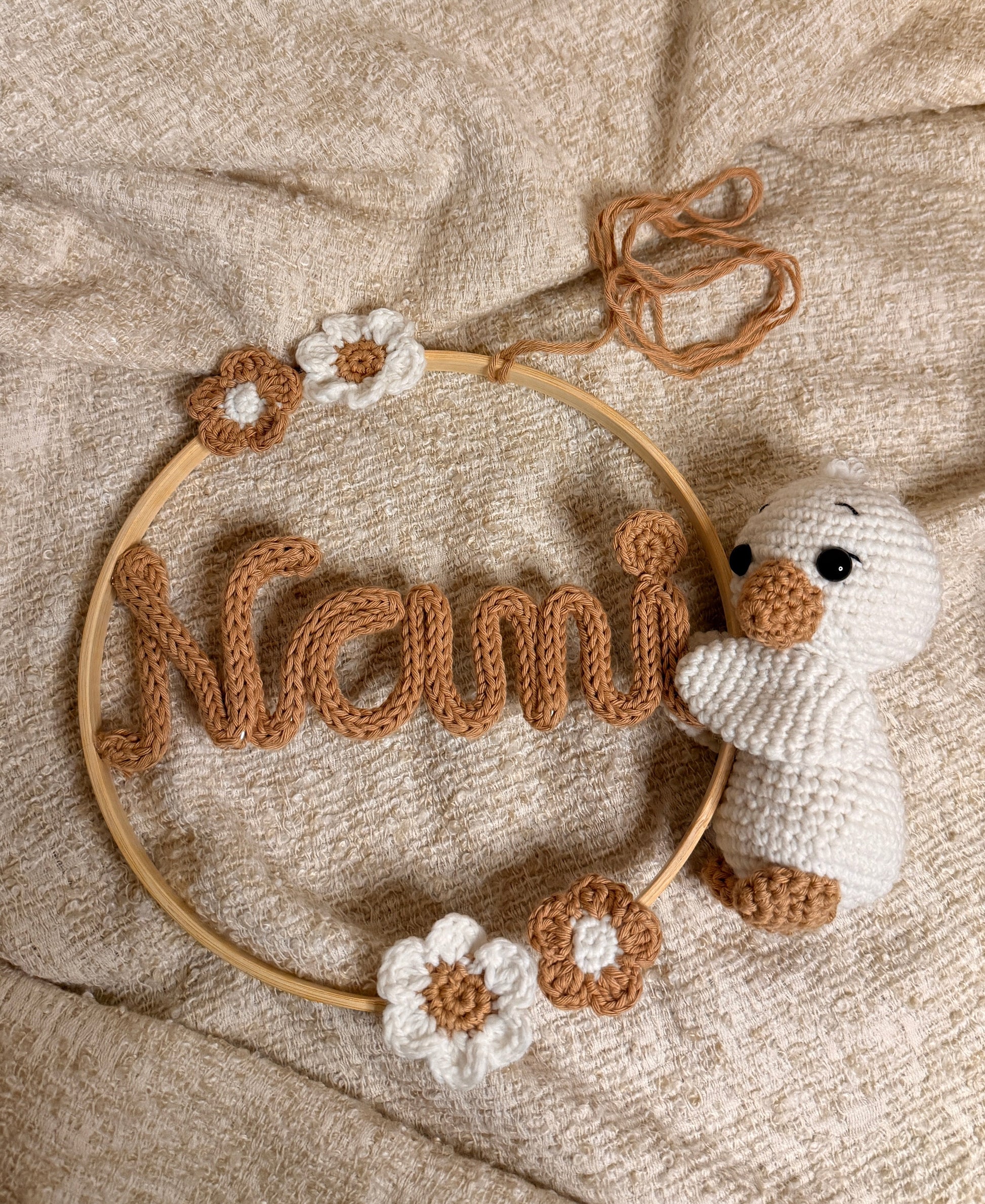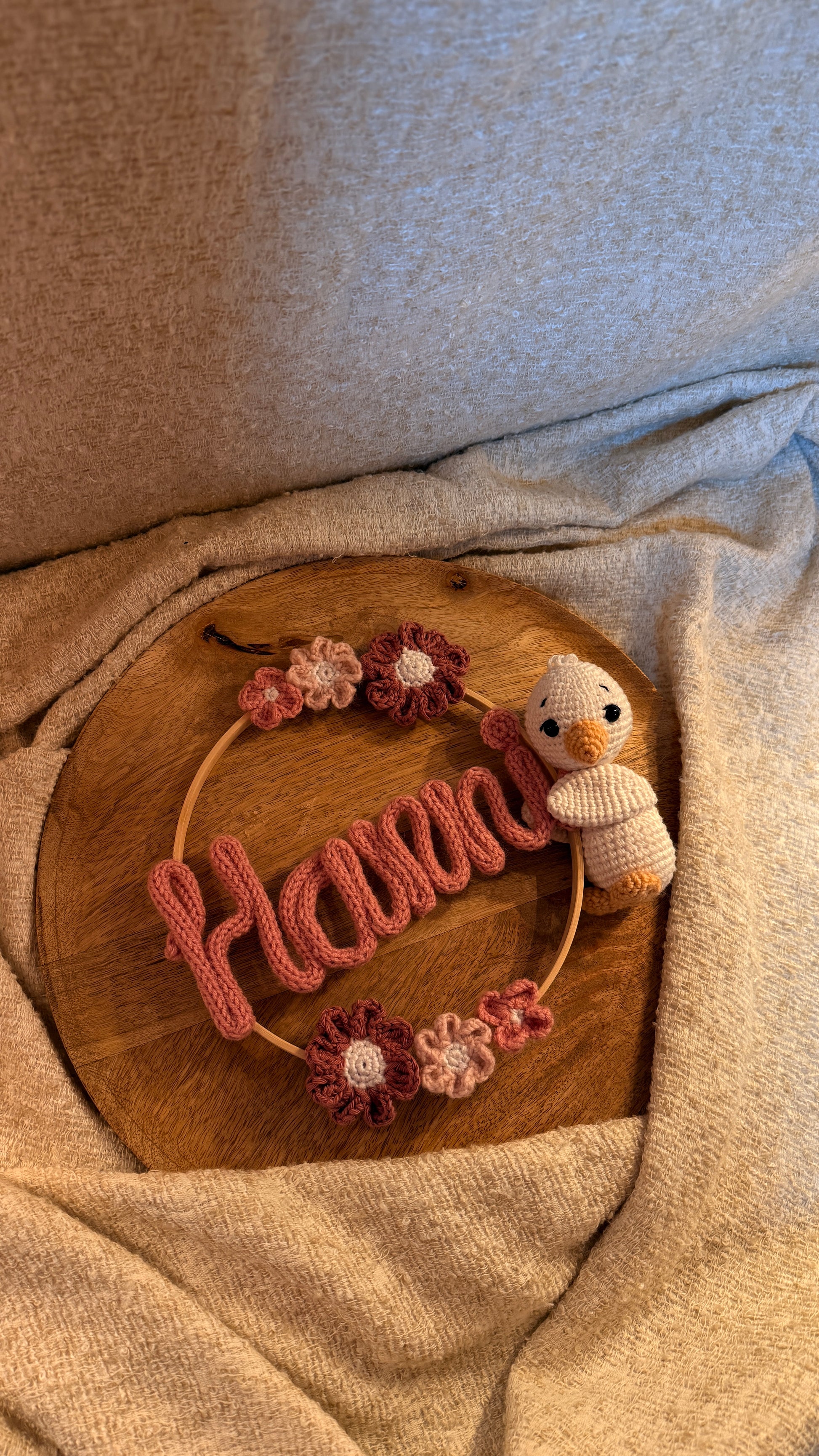 Der Schriftzug wird nach Wunsch angefertigt – Name, kurzer Spruch oder Wort deiner Wahl. Dazu kommen kleine, handgehäkelte Blumen, die du in Anzahl und Farbe selbst bestimmen kannst.